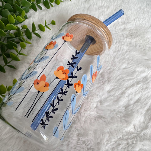 Floral Glass Coffee Cup, Garden Glass Iced Coffee Cup with Bamboo Lid and Straw, Iced Coffee Glass, Gift for Friend, Coffee Aesthetic 16oz