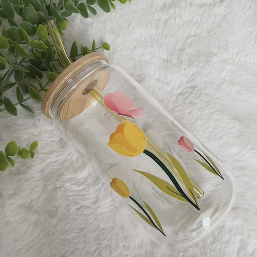 Flower Glass Coffee Cup, Tulip Flower Glass Iced Coffee Cup with Bamboo Lid and Straw, Iced Coffee Glass, Gift for Friend, Aesthetic UV DTF 16oz