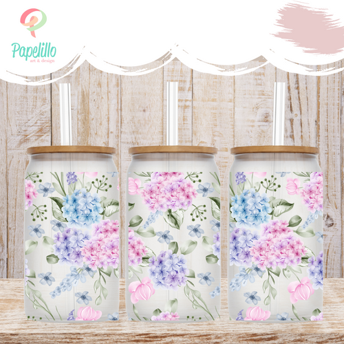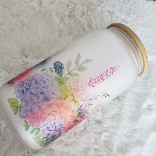 Floral Glass Coffee Cup, Hydrangea Garden Glass Iced Coffee Cup with Bamboo Lid and Straw, Gift for Friend, Iced Coffee, Coffee Aesthetic