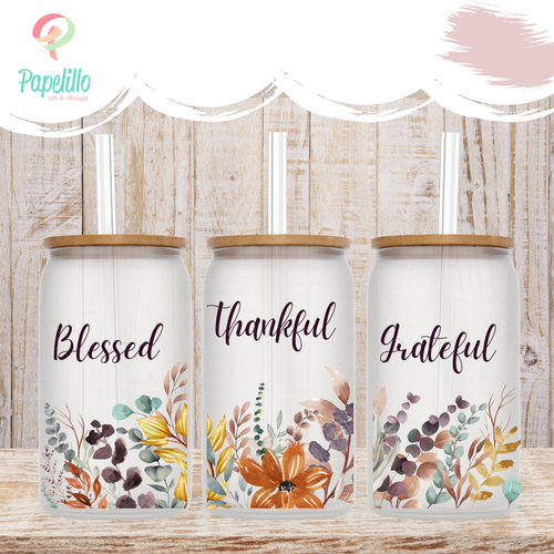 Grateful Thankful Blessed Glass Coffee Cup, Fall Floral Glass Iced Coffee Cup with Bamboo Lid and Straw, Iced Coffee Glass, Coffee Aesthetic 16oz