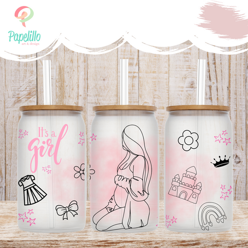 It's a Girl Coffee Cup, Pregnant Glass Iced Coffee Cup with Bamboo Lid and Straw, Iced Coffee Glass, Gift for Friend, Coffee Aesthetic