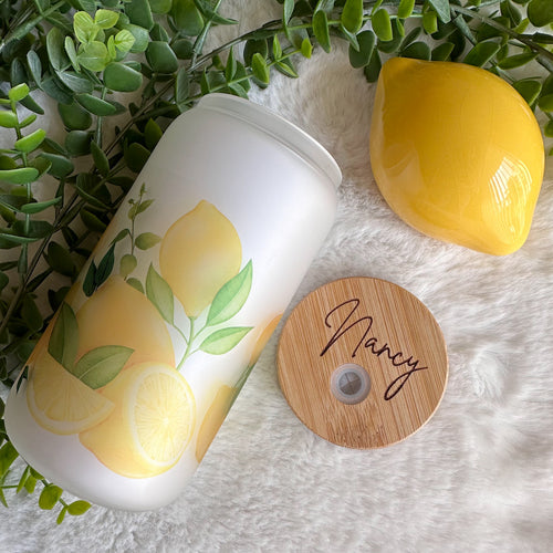 Lemon Glass Coffee Cup, Lemon Border Glass Iced Coffee Cup with Bamboo Lid and Straw, Iced Coffee Glass, Gift for Friend, Coffee Aesthetic 16oz