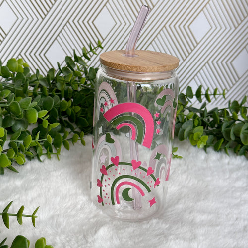 Rainbow Glass Coffee Cup, Pink Rainbow Glass Iced Coffee Cup with Bamboo Lid and Straw, Iced Coffee Glass, Gift for Friend, Aesthetic UV DTF 16oz