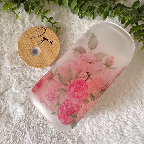 Pink Peonies Coffee Cup, Pink Floral Glass Iced Coffee Cup with Bamboo Lid and Straw, Iced Coffee Glass, Gift for Friend, Aesthetic