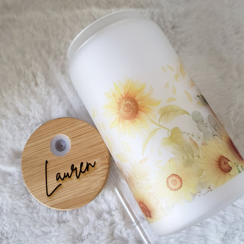Sunflower Glass Coffee Cup, Sunflower Glass Iced Coffee Cup with Bamboo Lid and Straw, Iced Coffee Glass, Gift for Friend, Coffee Aesthetic